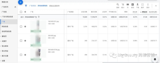 制作不同尺寸不同风格的图片展示素材,可在素材页面里查看某一些素材的点击率和转化率,针对点击率和转化都比较好的素材可提高出价,也要定期更换展示素材。在广告与附加信息-广告里查看每个素材的点击和转化情况。