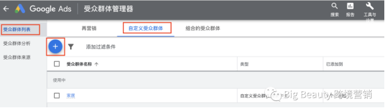 在谷歌ads账号后台-工具与设置-受众群体管理器-自定义受众群体